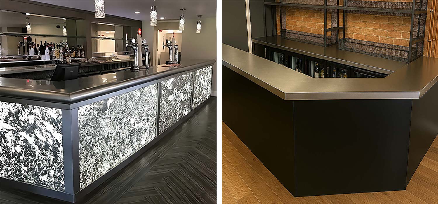 Stainless Steel: The classic choice for a clean, hygienic, and modern look. Our stainless steel bar tops are corrosion-resistant and incredibly easy to clean, making them perfect for high-traffic environments.